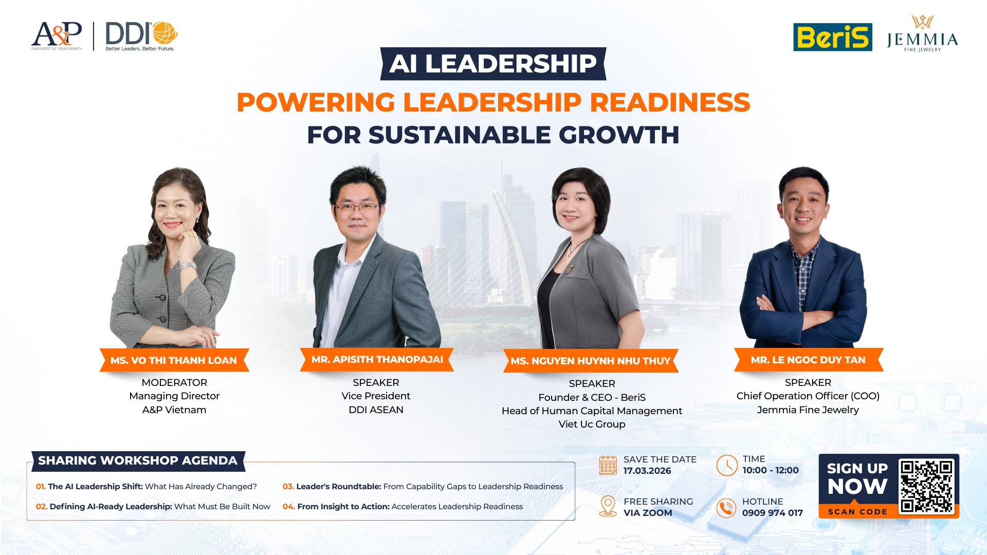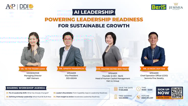 We are thrilled to announce an engaging online workshop titled "AI Leadership: Powering Readiness for Sustainable Growth" on March 17, 2026. This event, hosted by A&P Việt Nam, will feature distinguished thought leaders in the field of artificial intelligence and leadership, including guest speaker Beris Co. Ltd., alongside experts from DDI and Jemmia.